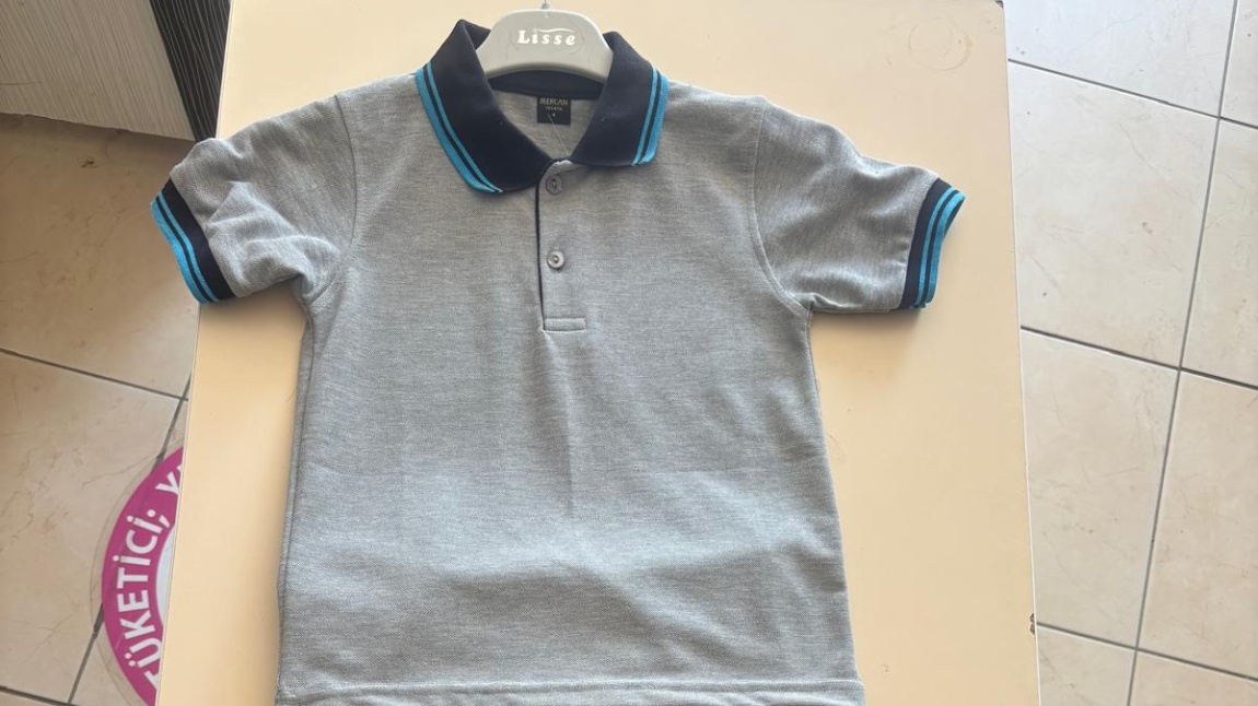 Thsirt: 30/1 , %100 pamuk penye lacoste kumaş, zemin renk gri, polo yaka 2 düğmeli olacak.